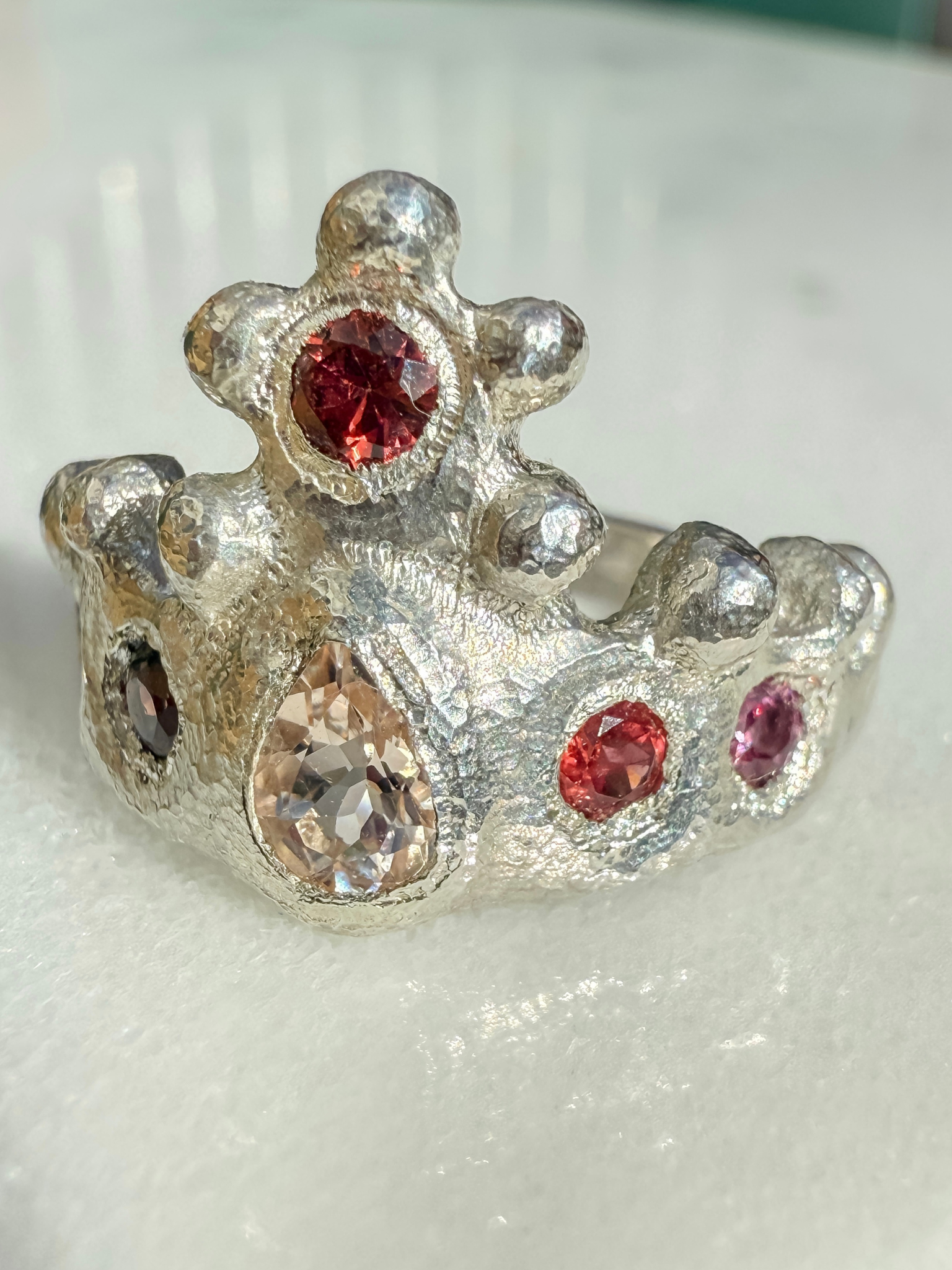 The Cherry Blossom Crown Ring is a one of a kind ring designed to look like a sparkling tiara that celebrates girlish glamour. Featuring a morganite pear and five round tourmalines in various shades of pink and berry, this ring is made from solid recycled silver with a hammered, textured finish. Handmade using the ancient technique of lost wax casting, this ring has an organic, perfectly imperfect asymmetrical shape, making it truly unique and one of a kind.