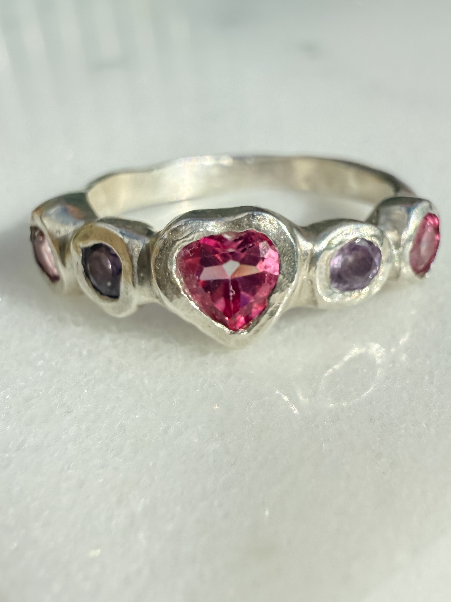 The Love Heart Ring is a one of a kind ring with a playful, romantic design handmade in solid recycled sterling silver. Featuring a vibrant pink topaz heart framed by sparkling Brazilian amethysts and pink topazes, this unique ring feels like it’s been lifted straight from Barbie’s jewellery box — a modern heirloom with a whimsical twist.